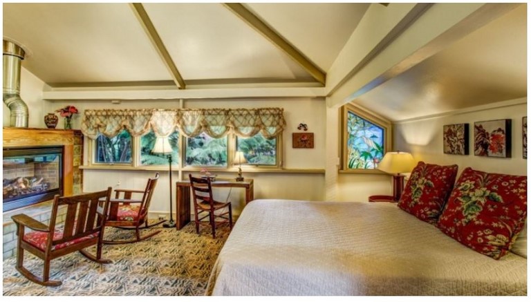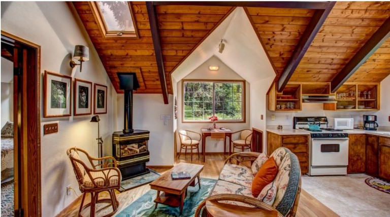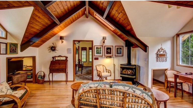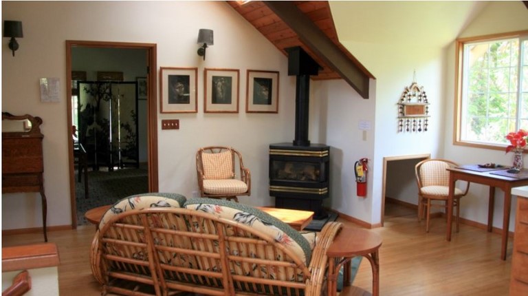 This is a Second story carriage house apartment adjacent to the Lodge. Kitchen, living room, private bath, bathrobes, WiFi, TV with DVD, phone, gas fireplace, queen bed. For additional guest, there is a roll-away and two floor futons. Housekeeping service daily and a complimentary breakfast at the adjacent Lodge restaurant included. Rate is based on double occupancy. Extra guests (ages 2 and older) are $20.00 per person. Can accommodate up to 5 guest.
