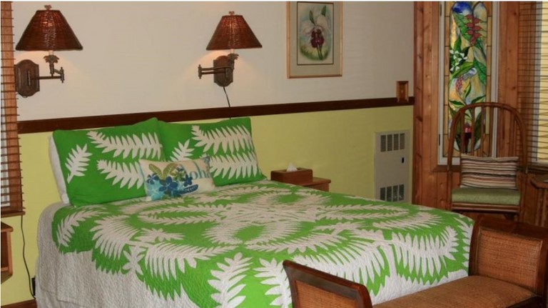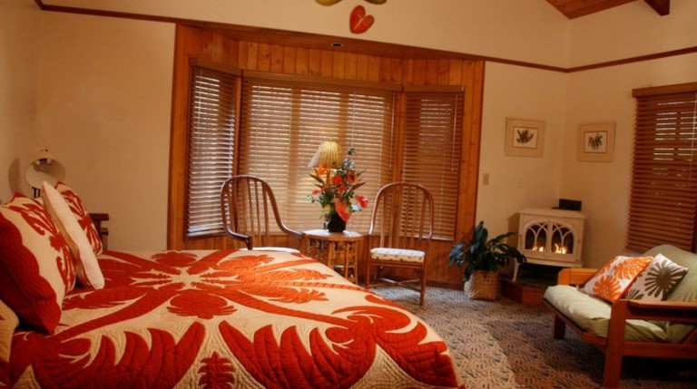 The Aloha King II Room features a spacious ground floor room with lanai, Norweigan made Jotul gas fireplace, king bed, private bath with heated towel warmer, bathrobes, and garden view. Reg. Rate $225/ night + tax. Discount Pricing may be available. Please inquire via our reservation form and we will let you know the Best Rate. Rate is based on double occupancy. Extra guests (ages 2 and older) are $20.00 per person. The Ohia Room can accommodate up to 4 guests with floor futons for any additional guests.