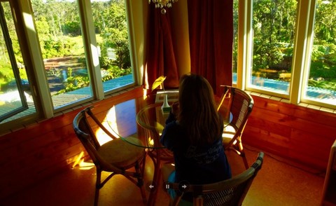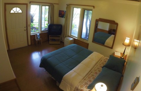 Our premier B&B rooms offer ample space for any guest and are located just upstairs from our common area in the main house. The window surrounded walls in these rooms look out onto our rainforest garden giving a unique and beautiful birds-eye view of the property, as well as a lot of natural light.