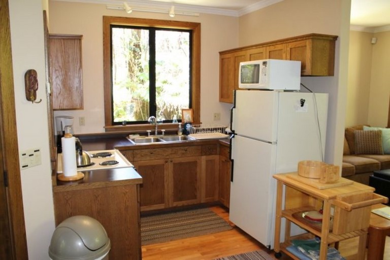 The modern cottage features a full kitchen, living area with wood burning fireplace, washer/dryer, hardwood floors, and oversize windows overlooking the rainforest. The master bedroom features a queen-size bed, full bath and shower. The second bedroom has a twin bed and an electric inflatable mattress, if needed. Free WiFi