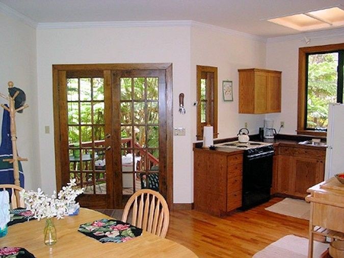 This rental was built in 1998 and is the modern version of a traditional Hawaiian cottage. Surrounded by Ohia trees and tree ferns, the seclusion of this cottage engenders a peaceful and quiet atmosphere to enjoy.