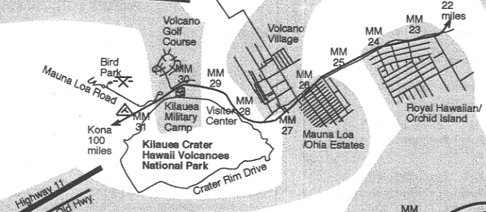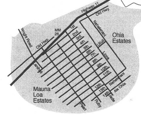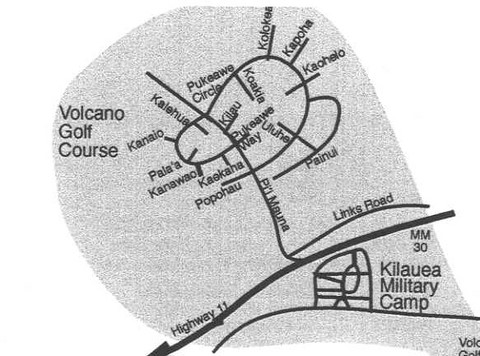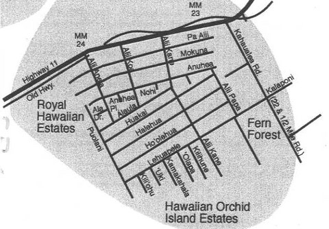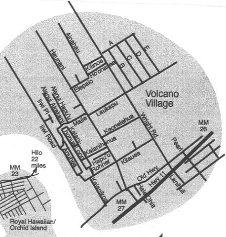 Volcano Village Map. The Volcano area is made up of 4 main neighborhood areas. Volcano Village, Mauna Loa Estates Royal Hawaiian Estates Orchid Island Estates and the Golf Course Subdivision. The Volcano boundary lines are the Golf Course subdivision to the West, and Kehaualea Road ( at Akatzuka Orchid Gardens ), to the East.