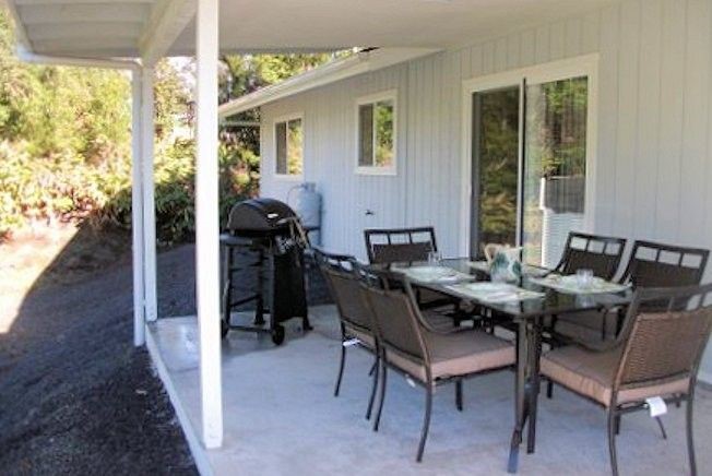 Beautiful new house. Three bedrooms, two full baths, full kitchen and dining area and a living room with gas fireplace with attached two-car garage. Volcano Golf & Country Club and Volcano Winery is a five minute walk, Volcano National Park and Volcano Village with its arts, crafts, and wonderful restaurants are both a 5 minute drive. Flat screen TV in every room with cable, DVD in Living room, phone, wireless internet, washer and dryer. Back patio has table, chairs, and gas grill. Very comfortable and fully furnished house has everything to make your stay enjoyable. Free WIFI.